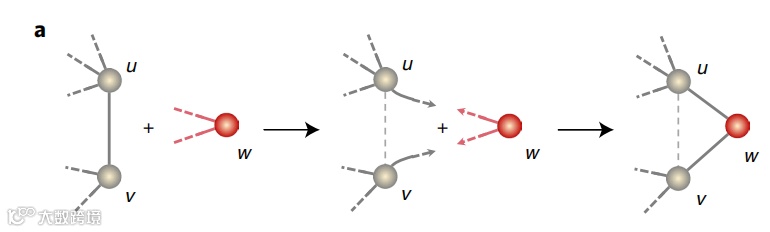 保度生长模型假设网络中不存在节点间的多重连边和自循环圈。其基本生成机制如下图所示,每一步节点w移除已有网络G中的k条连接,之后增加2k条新的连接(新加入的连接相互独立,否则可能形成环状结构),由此保持平均度数不变。这一过程,可以看成是新加入的节点,破坏了左图中竖线的连接,增加红线的连接,最终成为已有节点u和v之间的枢纽。