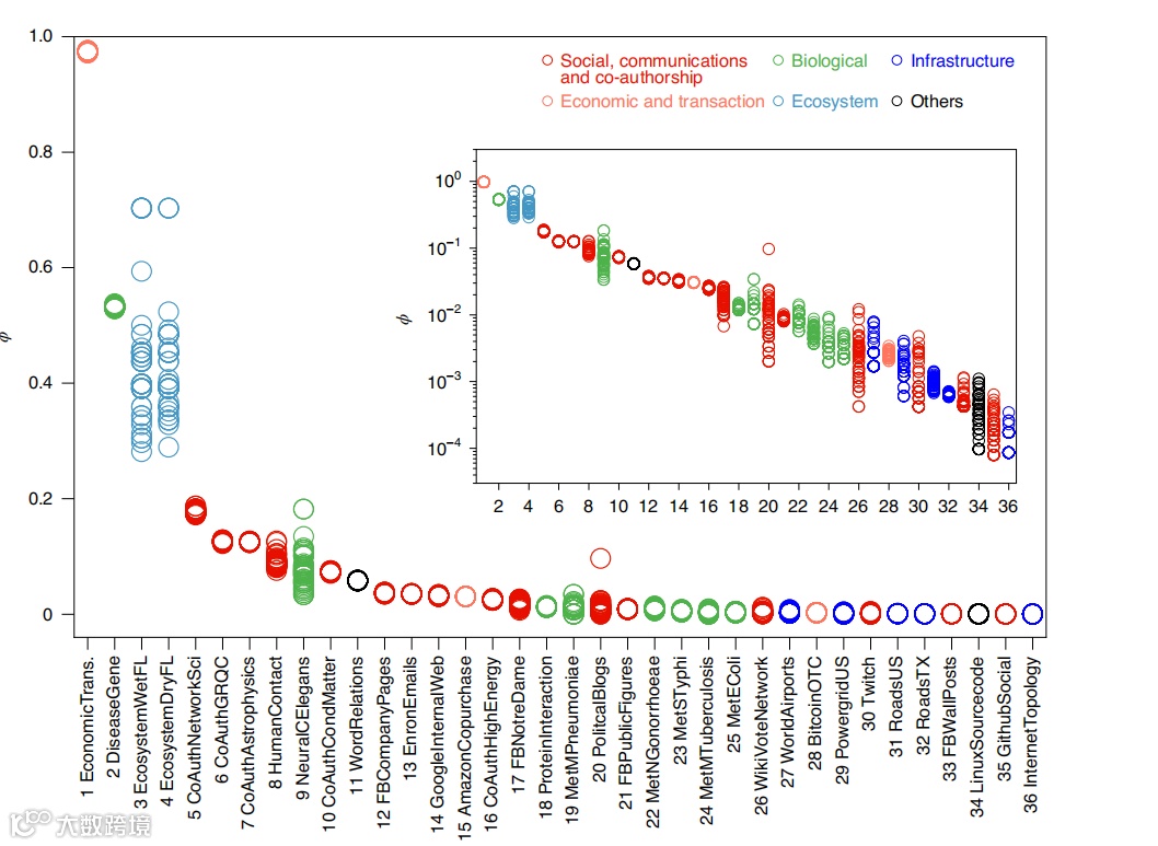 该图中,最不适合使用保度生长构建的网络,前4名中,1、3、4都是过于稠密的网络。这样平均度数过大的网络,天然不适合度数维持一致的生成模型。而对于较为稀疏的网络,唯一的例外是疾病和基因的关联网络。除此之外,大部分的网络,都可以使用保度生长的方式逐个拆解,这说明了在这些有明显差异的现象背后,可能有着共同的生成机制。