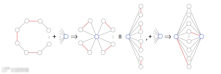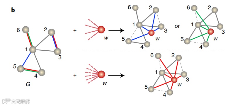 当有更高度数的节点加入网络时,可能的减少边的方式,随着新增节点的而改变。当加入的节点度数为4,可能的方式包括两种(下图中的蓝线或绿线),而当新增的节点度数是6时,可能的删除边的方式只有一种(下图中的红线)。