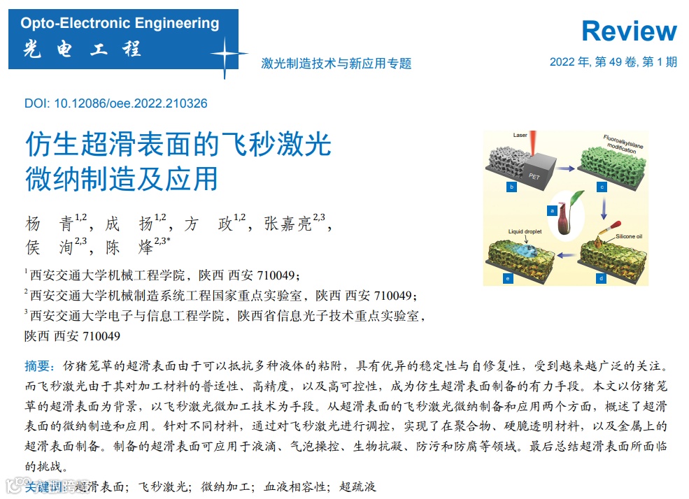 该综述以“仿生超滑表面的飞秒激光微纳制造及应用”为题作为封面文章发表在《光电工程》2022年的第1期。该研究受到国家自然科学基金(62175195,61875158)、国家重点研发计划(2017YFB1104700)以及中央高校基本科研业务费资助。