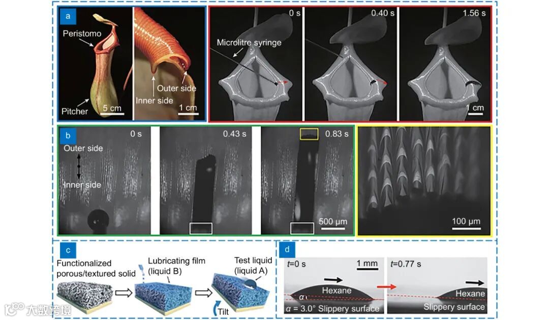 图1 猪笼草表面结构及其超滑性能。(a)猪笼草的光学照片;(b)猪笼草的微观形貌;(c)放猪笼草超滑表面的制备流程;(d)正十六烷在超滑表面的滑动性能