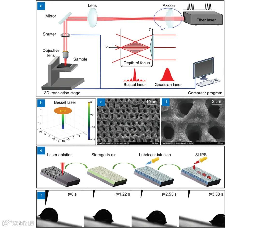 2020年,Cheng等人[3]通过对飞秒激光进行时间整形和空间整形,在空气环境中利用飞秒激光在金属镍钛合金表面制备出仿生超滑表面(图3)。在时间域上通过外触发脉冲波选频的方式,实现一定频率的脉冲串输出,在空间域上利用锥透镜将飞秒激光光场从高斯分布转换为贝塞尔分布,最终在空气环境下直接在镍钛合金表面构建出具有高深径比的微纳多孔结构。随后通过空气放置来吸收空气中的烃基实现自身的低表面能化,进一步的医用级全氟萘烷灌注实现了镍钛合金超滑表面的制备。这种超滑表面的制备不仅效率高,可以实现大面积样品加工,而且没有使用化学处理,真正做到安全环保。