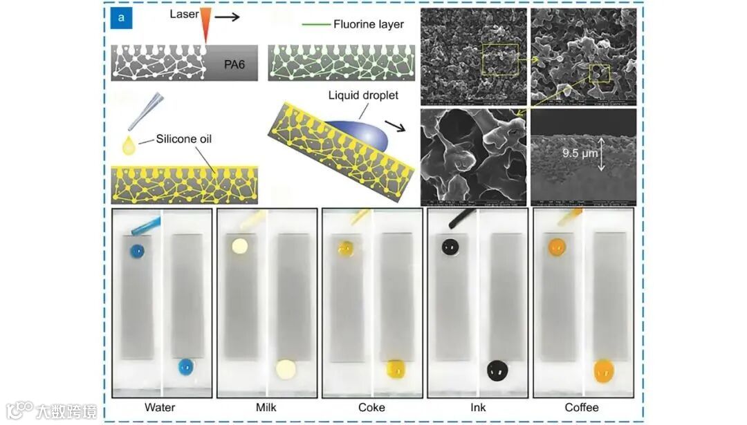 2017年,Yong等人[2]率先利用飞秒激光直写技术在聚酰胺(PA6)表面制备出超滑表面,如图2所示,激光扫描过后的PA6表面分布着厚度约为10 µm、直径1 µm的三维网状多孔结构。在激光烧蚀过程中,多光子的非线性吸收使得表面瞬时产生高温高压的等离子体,与此同时产生的大量气体会不断溢出,熔融物在气体溢出时重新固化,生成三维网状多孔结构。经过后续的氟化处理以及硅油灌注,形成的超滑表面不仅对低表面张力的十六烷(表面张力 = 27.5 mN/m)具有疏液性,还对各种混合液如咖啡牛奶、蛋黄等具有良好的疏液特性。该方法不仅可应用于PA6,还同样可应用于PMMA(聚甲基丙烯酸甲酯,俗称亚克力)、PA(聚酰胺,俗称尼龙)等高分子材料。