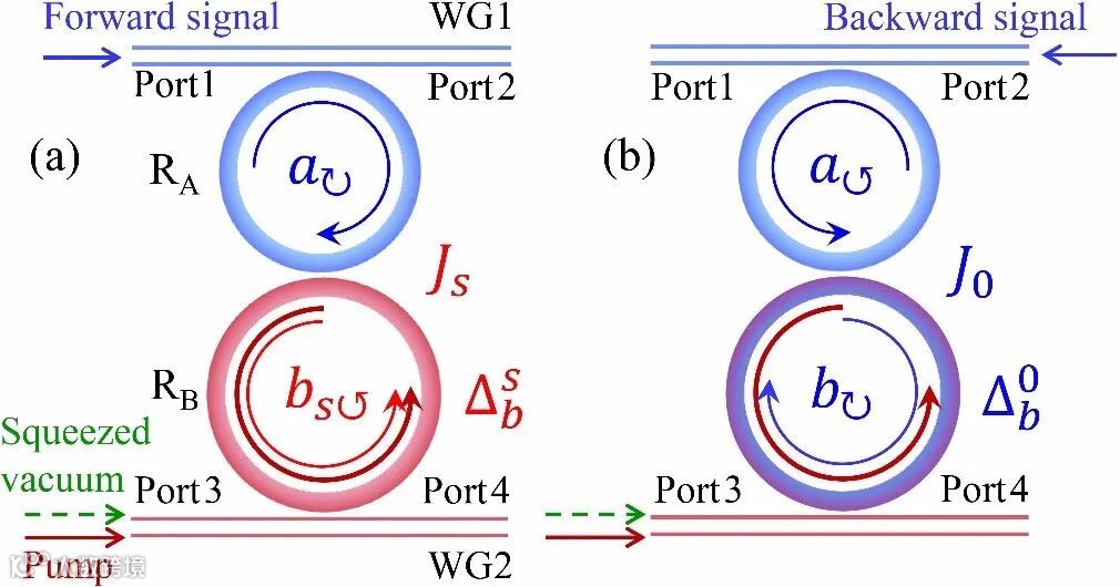 图1 利用经典光泵浦铌酸锂微腔压缩腔模诱导光子——光子手性耦合,实现非互易光传输。(a)正向信号光入射,量子压缩调制的光子——光子耦合; (b)反向信号光入射,腔模相互作用不受量子压缩调制。