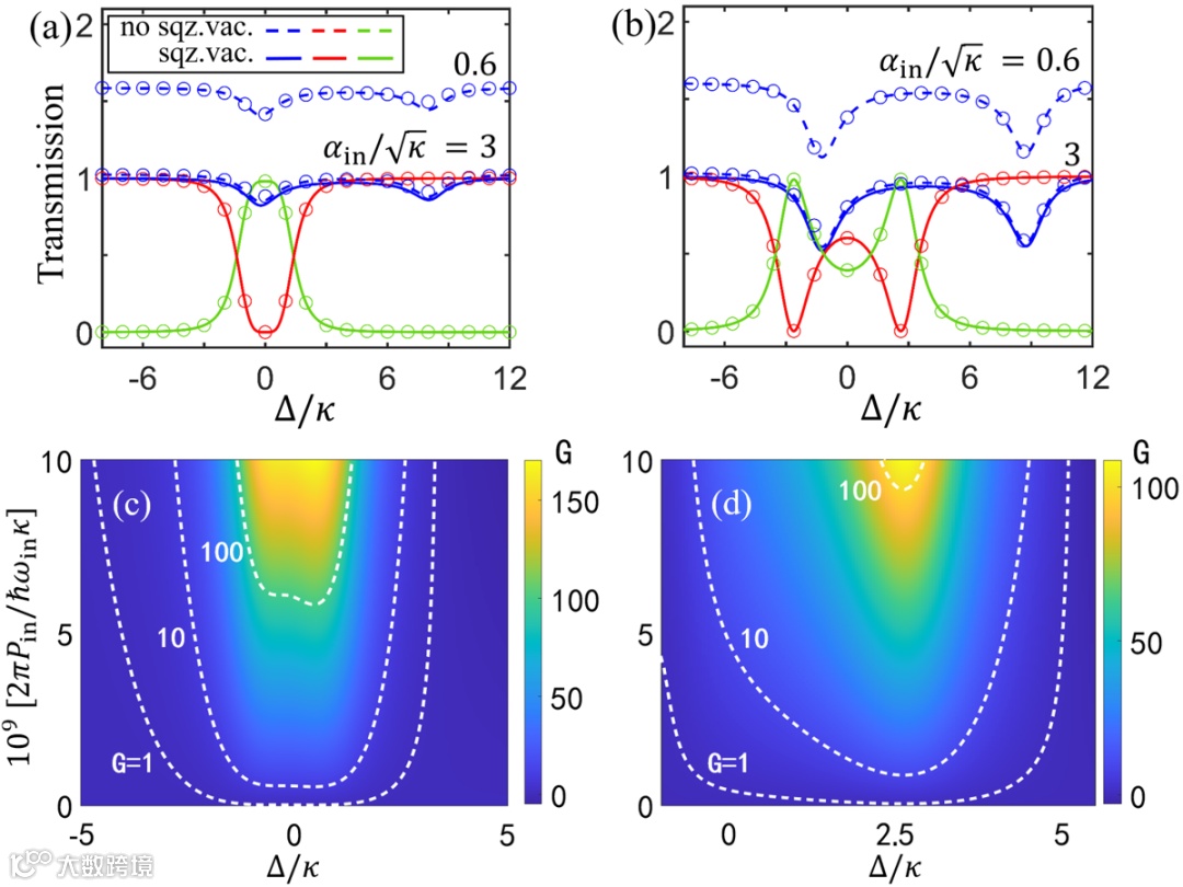 图2 (a,b)光隔离器与光环形器的透射谱,红色曲线表示T12,蓝色曲线表示T21,绿色曲线表示T23;(c, d)光子晶体管的增益。