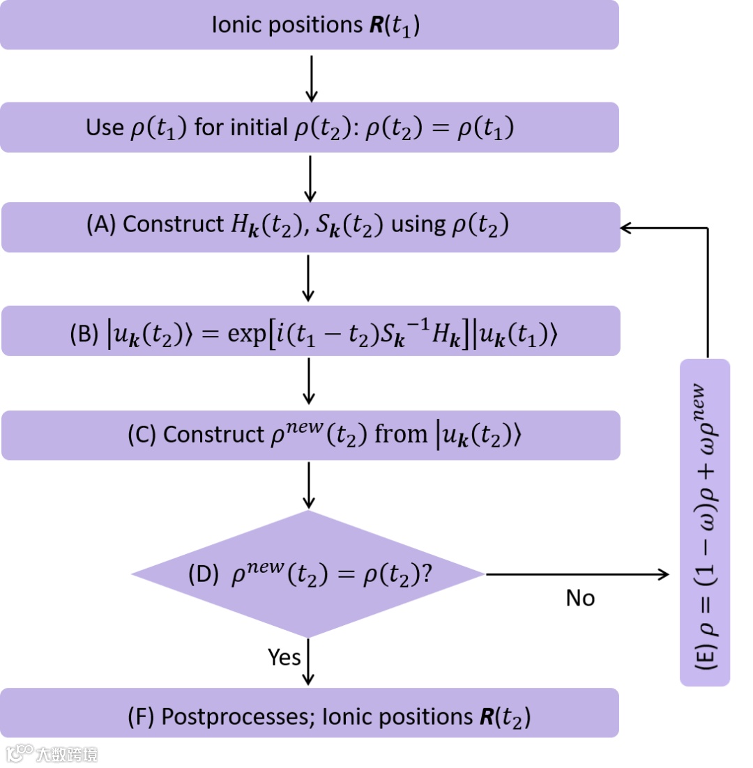 图1. 利用TDDFT处理耦合的电子-离子动力学演化的流程图