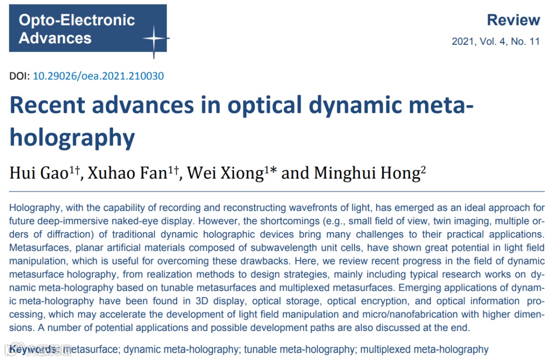 文章 | Gao H, Fan XH, Xiong W, Hong MH. Recent advances in optical dynamic meta-holography. Opto-Electron Adv 4, 210030 (2021).