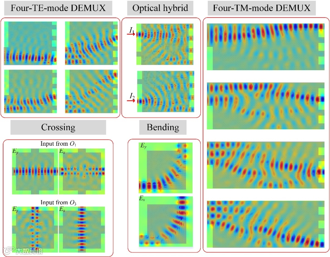 为了有效地减小光子模块的体积,首先需要缩减基本功能器件的尺寸,该研究首先基于逆向设计器件设计了五个超紧凑的片上介质超表面功能器件,包括的TE四模式解复用器(4.8×4.8 μm2)、光学混频器(4.8×4.2 μm2)、交叉波导(3.6×3.6 μm2)和弯曲波导(2.4×2.4 μm2)。文章还设计了TM四模式解复用器(9×4 μm2)。图2给出了五个独立器件的传播场仿真结果,表明这些器件可以很好的完成对应的功能,可以看出这些器件的特征长度通常只有几个微米,比传统器件要小一个数量级以上,为光子器件的小型化提供了一种有力的方法。