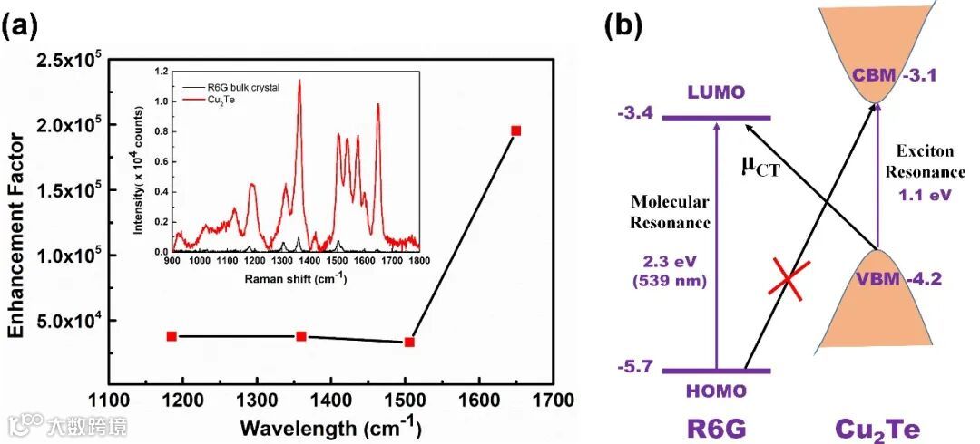 为了解释CuTe2的SERS增强特性,研究团队对增强的机理进行了分析,结果表明CuTe2微米盘对R6G分子具有较大的电子迁移调制作用,R6G的LUMO能级和CuTe2价带两者之间的电子跃迁促使了SERS增强特性。这一结论,得到了浓度依赖的拉曼信号调制实验的进一步证实。