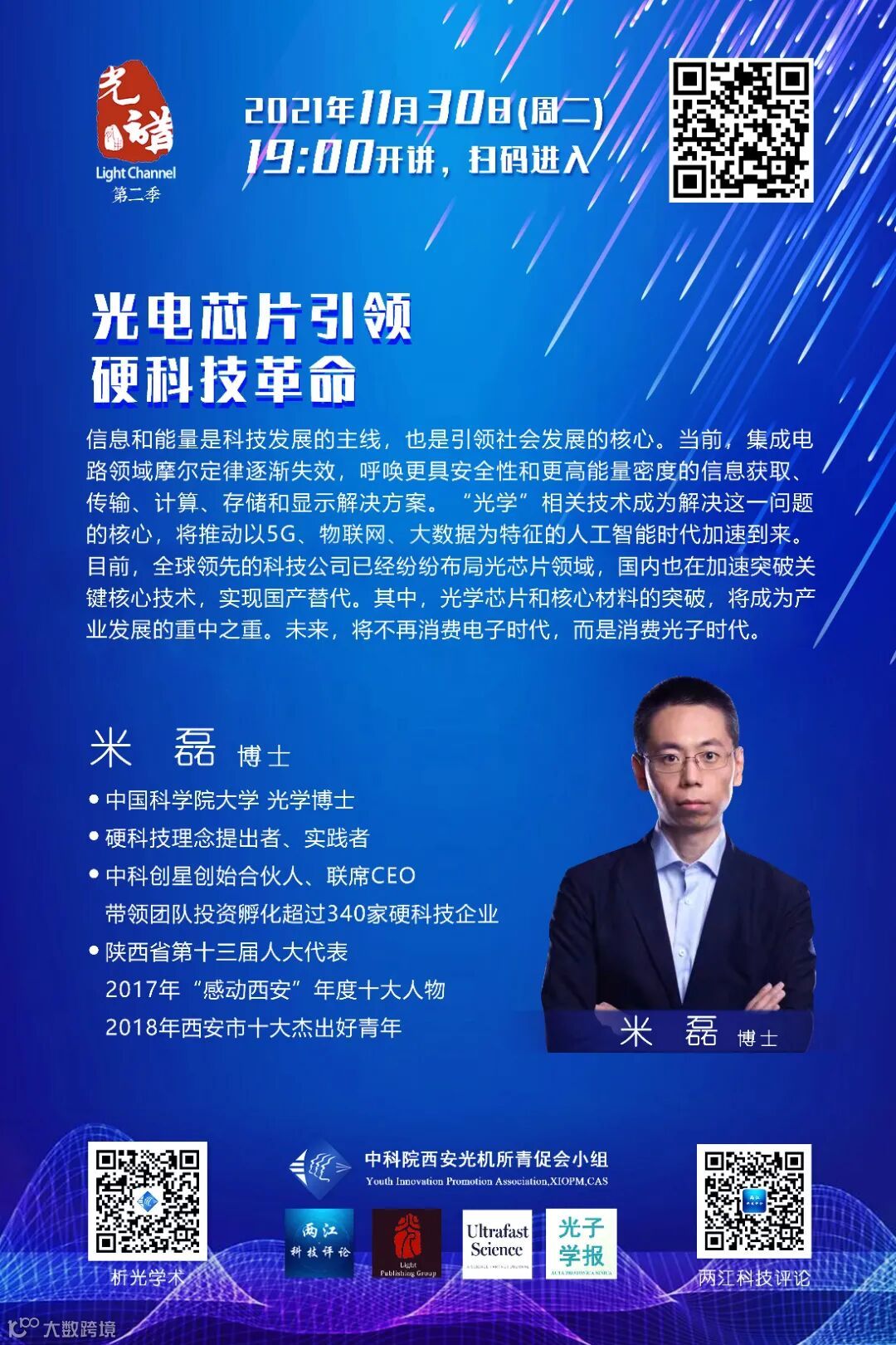米磊,中国科学院大学光学博士;硬科技理念提出者、实践者;中科创星创始合伙人、联席CEO,带领团队投资孵化超过340家硬科技企业;陕西省第十三届人大代表、2017年“感动西安”年度十大人物、2018年西安市十大杰出好青年。