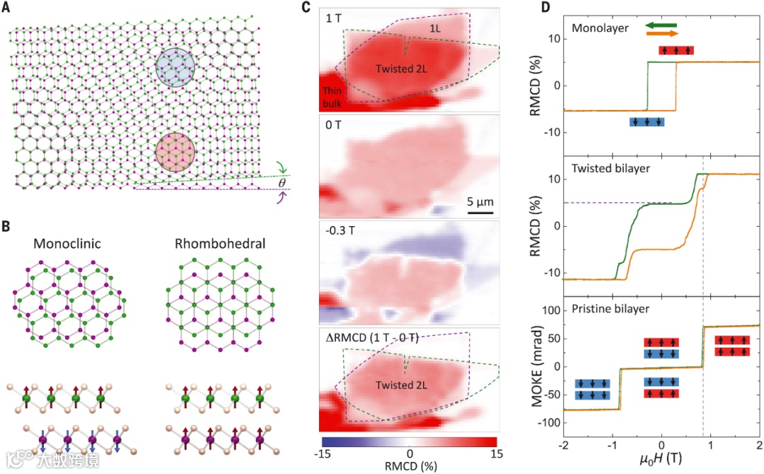 在双层CrI3,将层堆叠从单斜变为菱面体可以将层间交换耦合的符号以及磁基态分别从反铁磁(AFM)转换为铁磁(FM)。此外,在扭曲的双层CrI3中,可以出现单斜和菱面体堆叠区域(图1A,蓝色和红色阴影区域),这应该导致AFM和FM域在小扭曲角极限处共存(图1A、1B)。作者利用“撕裂和堆叠”技术制造的~0.2°扭曲双层CrI3样品(D1)开始研究。图1C与图1D的结果意味着AFM和FM域共存,可能来自单斜层和菱面体层堆叠在扭曲双层CrI3中的共存。此外,扭曲双层的零场RMCD信号约为1T以上饱和RMCD信号的一半,相当于附近的单层信号,这意味着AFM和FM域之间的划分接近相等。然而,由于光学测量的空间分辨率,在扭曲双层区域只能观察到均匀的RMCD图。这表明磁畴尺寸远小于~1μm的激光光斑尺寸。