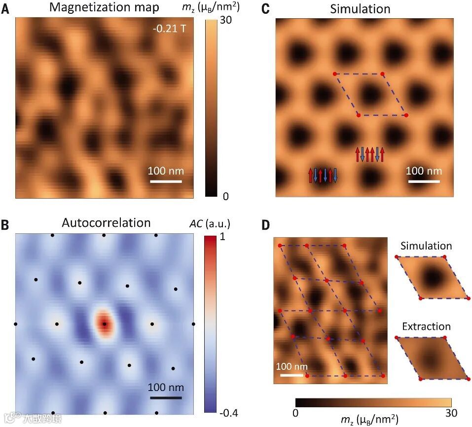 一般来说,磁化图中清晰的全局周期性仍然被无序所掩盖。然而,仔细检查磁化图会发现几个微米大小的明显周期性区域。磁化图如图4A所示似乎是六边形的周期性图案。为了定量捕捉潜在的周期性和对称性,作者计算了空间相关磁化强度的自相关函数,磁化图的归一化自相关如图4B所示,显示出略微无序的六边形晶格,晶格常数为~150 nm,推断的扭曲角为~0.25°。作者首先根据实验中确定的样品与NV中心之间的距离来模拟从预测的磁结构发出的杂散磁场。然后从模拟的杂散磁场重建磁化图并显示六边形晶格,这与实验观察一致(图4C)。莫尔晶胞内的磁结构可以从磁化图中提取。如图4D所示,捕捉周期性和对称性的自相关用于识别莫尔超晶格。