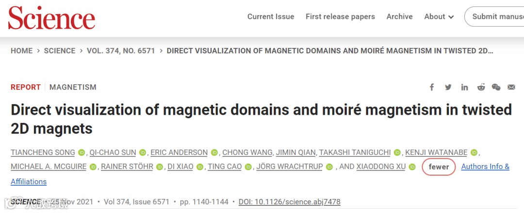 鉴于此,来自于华盛顿大学许晓栋教授团队使用单自旋量子磁力计来研究扭曲的二维磁铁三碘化铬(CrI3),直接可视化纳米级磁畴和周期性图案、莫尔磁的特征以及测量的磁畴尺寸和磁化强度。在扭曲的双层CrI3中,作者观察到反铁磁(AFM)和铁磁(FM)域与无序空间模式的共存。在扭曲的双层CrI3,出现具有周期性图案的AFM和FM域,这与计算的空间磁结构非常一致,这些结构是由CrI3莫尔超晶格中的局部堆叠依赖的层间交换相互作用产生的。该结果突出了磁性莫尔超晶格作为探索纳米磁性的平台。相关研究成果以题为“Direct visualization of magnetic domains and moiré magnetism in twisted 2D magnets”发表在最新一期《Science》上。值得注意的是该团队上周刚发Nature综述(华盛顿大学许晓栋教授最新《Nature》综述!),不愧是低维量子材料的知名学者。