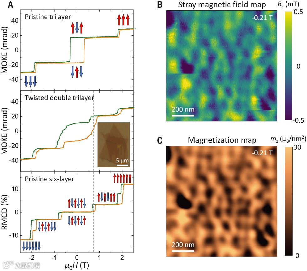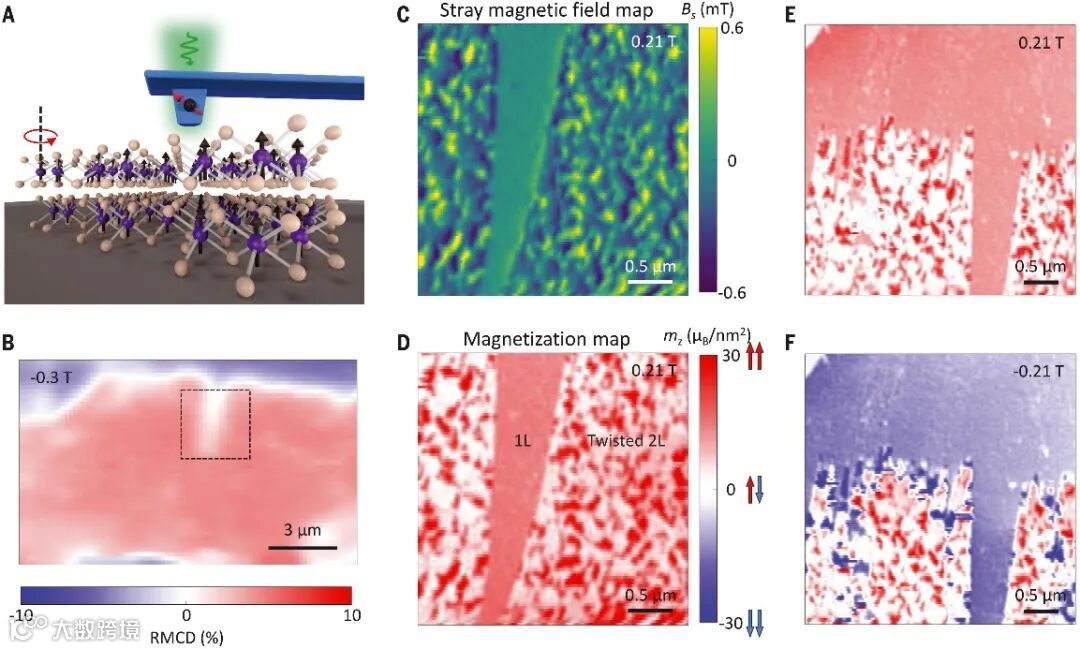 图 3. 扭曲双三层CrI3的磁光和扫描NV磁力测量