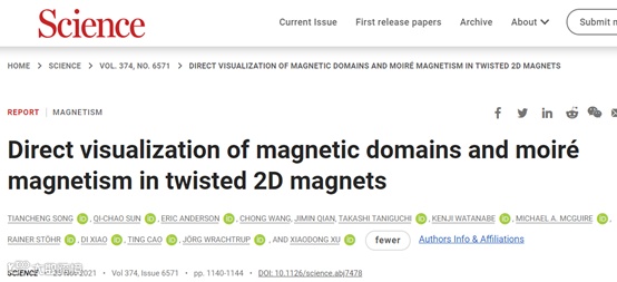 仅仅8天之后,许晓栋教授再次以通讯作者在Science发表题为“Direct visualization of magnetic domains and moiré magnetism intwisted 2D magnets”的研究论文,报道了他们在二维磁性材料研究领域的新突破。