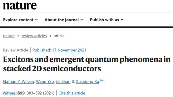 2021年11月17日,许晓栋教授以通讯作者在Nature发表题为“Excitons and emergent quantum phenomena in stacked 2D semiconductors”的综述文章,对双层二维半导体材料量子物理领域近年来的关键进展,进行了全面回顾,并为未来发展指明了方向。
