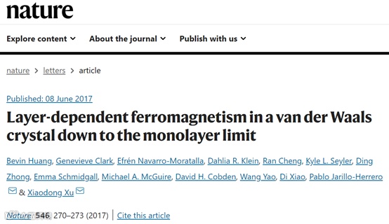 2017年11月26日,华盛顿大学许晓栋课题组与麻省理工学院PabloJarillo-Herrero课题组利用物理剥离的方法,首次制备出具有本征磁性的单层二维CrI3(碘化铬)。研究发现,单层CrI3二维材料为伊辛铁磁体,具有面外自旋取向,居里温度为45K。(在同期Science中,香港大学张翔教授等人也在原子级二维Cr2Ge2Te6材料中发现本征磁性)