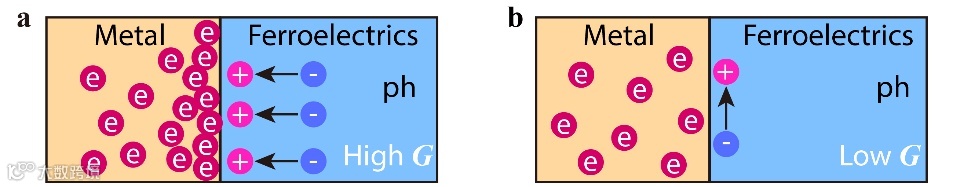 图1 铁电极化方向对金属/铁电体界面热导的影响。a, 存在界面净束缚电荷的金属/铁电体界面具有高热导;b, 不存界面净束缚电荷的金属/铁电体界面具有低热导。