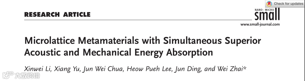 X.W. Li, X. Yu, J.W. Chua, et al. Microlattice Metamaterials withSimultaneous Superior Acoustic and Mechanical Energy Absorption. Small,2021: e2100336
