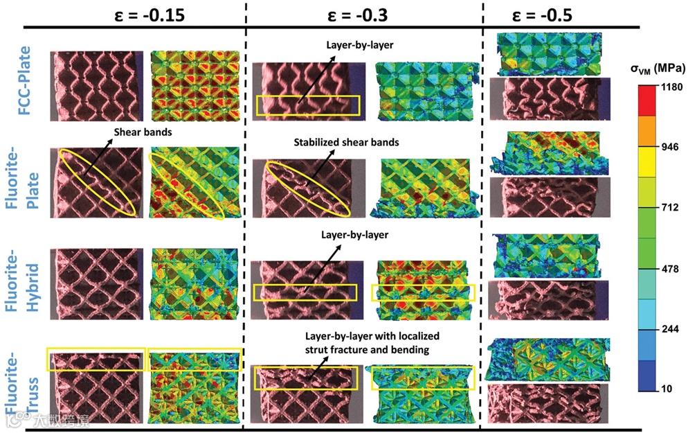 图5 不同晶格的力学响应与变形模式