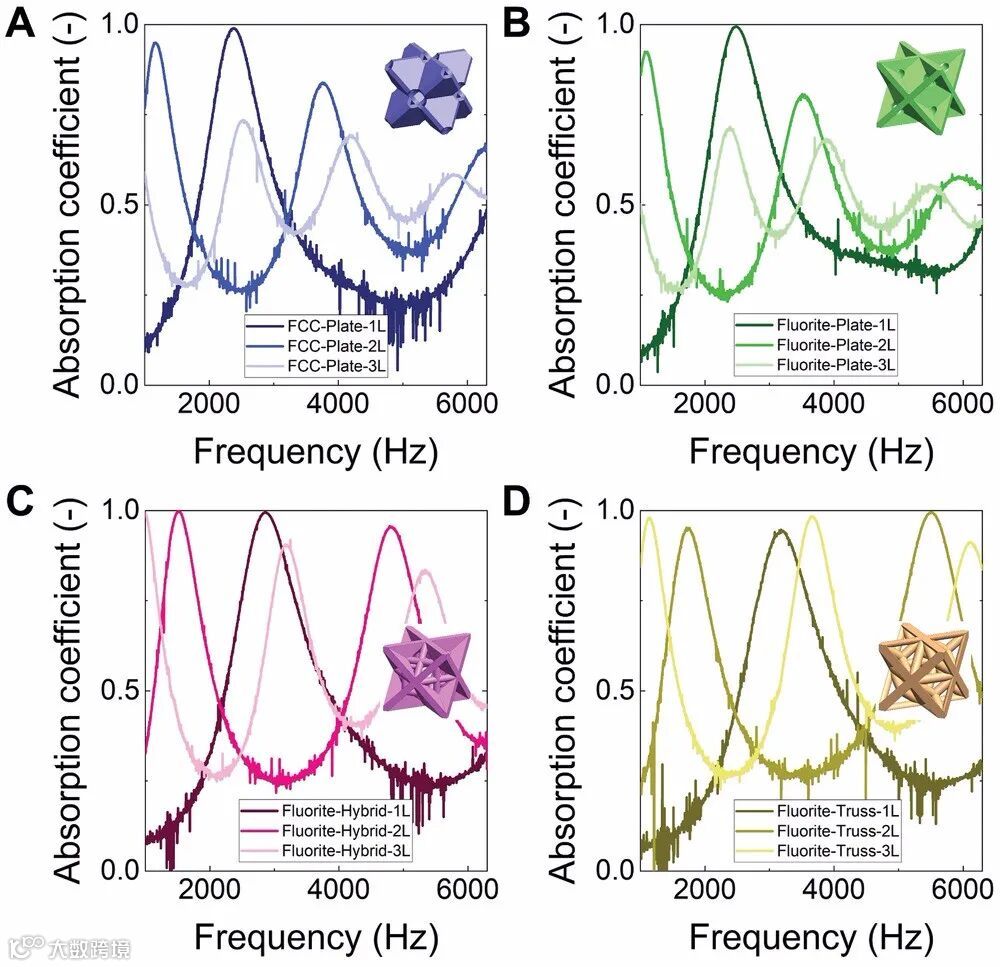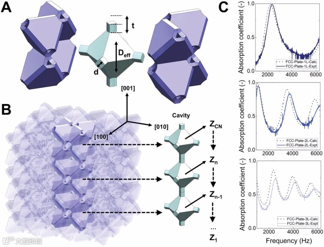 为了实现声学功能与力学的性能设计的完美融合。同时基于模块化设计理念实现反射波和透射波的高效地控制,达到不同频率的完美吸声的效果,但是自然界没有提供兼具上述声学功能和力学特性的材料为我们选用。为此,该课题组选取面心立方作为研究结构,提出了四类兼具优异声学功能和力学性能的面心立方衍生微晶格超构材料(最优吸声系数接近于1、比吸能为50.3J/g)。其构思精巧之处在于通过在面板晶格的交点处引入圆孔,一方面解决3D打印过程中内部残留物的排除的问题,另一方面,面板之间通过孔的连接形成了一个亥姆霍兹共振腔。更重要的是圆孔在一定程度上避免了面板交界处的应力集中。该设计为结构、功能一体化设计提供了一个很好的范例。