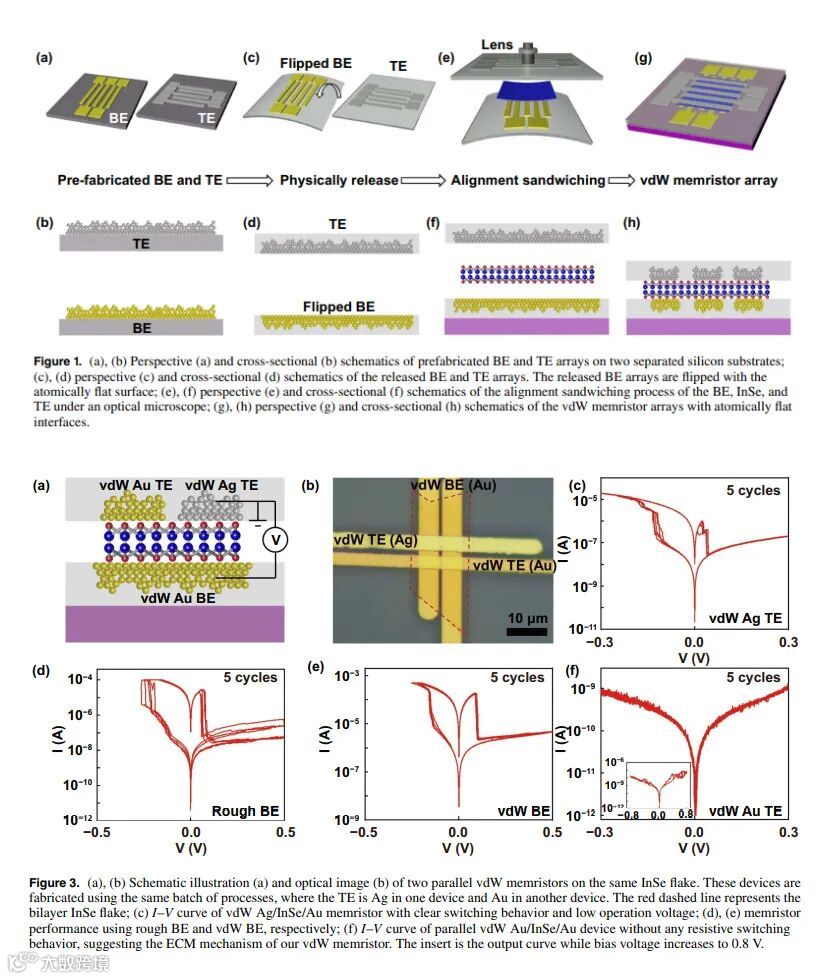 忆阻器在高密度存储器和神经形态计算中引起了极大关注。然而,尽管近年来付出了巨大努力,但高工作电压、稳定性差和器件可变性大仍是其实际应用中的关键限制因素,这一定程度上归因于电极和通道材料之间的界面尚未优化。我们首次展示了在二维通道材料两侧物理夹入预制金属电极的范德华 (vdW) 忆阻器。原子级平底电极确保通道和电极之间的紧密接触(因此工作电压低),顶部电极的 vdW 集成避免了由侵蚀性制造工艺(例如溅射、光刻)直接应用于通道材料而带来的损伤,提高了元件稳定性。同时,我们还展示了具有1010cm−2的高集成密度、高稳定性的忆阻器阵列,其最低设置/复位电压为0.12 V/0.04 V,据我们所知,这是基于2D的忆阻器目前报道的最低值。此外,我们还通过详细的表征来证实改进的忆阻器行为是优化金属/通道界面的结果。该研究不仅展示了一种低电压高鲁棒性忆阻器,同时还为氧化物基忆阻器等其他受制于非理想的接触集成、高工作电压和元件稳定性差的忆阻器提供了一种通用的电极集成方法。