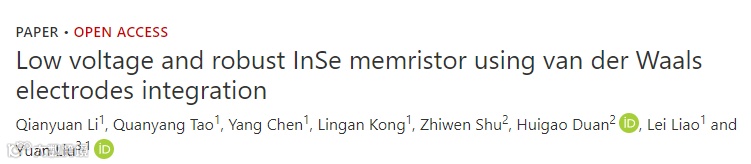 Li Q Y, Tao Q Y, Chen Y, Kong L G, Shu Z W et al. Low voltage and robust InSe memristor using van der Waals electrodes integration Int. J. Extrem. Manuf. 3, 045103 (2021).