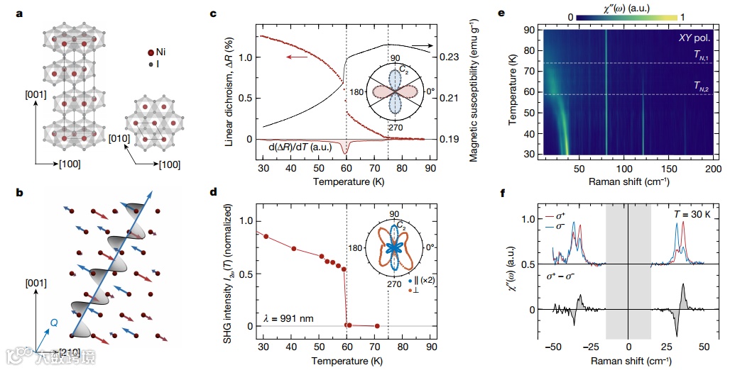 近日,麻省理工学院Riccardo Comin团队在Nature上发文,报道了在基于过渡金属范德华材料NiI2的单原子层中,发现了II型多铁性有序。NiI2多铁性状态的特征在于,具有给定手性的适当螺旋自旋 proper-screw spin helix,其耦合到电荷自由度以产生手性控制的电极化。圆二向色拉曼测量直接探测磁手征基态及其源于动态磁电耦合的电磁子模。将双折射和二次谐波产生测量与理论建模和模拟相结合,探测到一个高度各向异性的电子态,同时打破了三重旋转和反转对称性,并支持极序。作为温度和层数函数的光学特征演变,揭示了有序磁极态,其持续到单层NiI2的超薄极限。这一发现,为NiI2和过渡金属二卤化物在二维极限下研究多铁性现象、手征磁织构和铁电性提供了新平台。