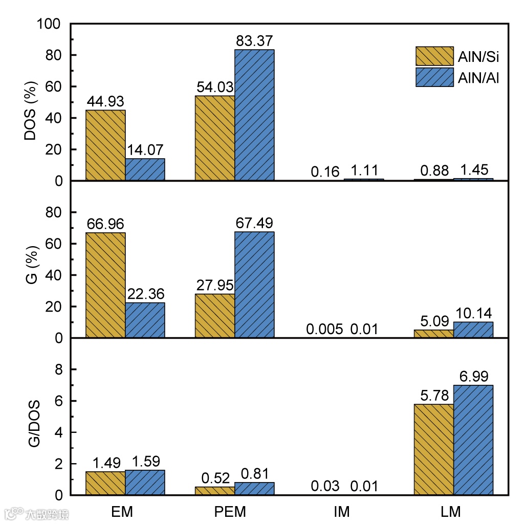 研究者进一步计算了AlN/Si和AlN/Al体系每类界面声子对热导G的贡献。扩展模式因为在界面及两侧都有振动分量,可以充当连接两侧声子的桥梁,因此每个模式对界面热导的贡献(G/DOS)比部分扩展模式更大。事实上,在Si/AlN系统中扩展模式数目占总DOS的约45%,但在AlN/Al系统中仅占总DOS的约22%,这意味着AlN/Si的界面热导要大于AlN/Al的界面热导。孤立模式对界面热导的贡献很小,因为界面附近没有原子振动,热能无法随声子传递过去。局域模式的声子每支具有最高的贡献,但它们的数目太低使它们总的贡献不超过总界面热导的10%。