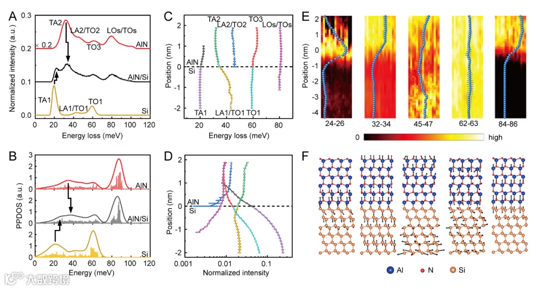 图 2 AlN/Si界面处的界面声子。(A) 实验测量的EELS谱和(B)模拟计算的体态AlN、AlN/Si界面和体态Si 的投影态密度的面内分量。箭头表示界面处Si-TA1模式和AlN-TA2模式发生了蓝移。在AlN/Si界面高斯拟合分峰得到峰的位置(C)和强度(D)。(E)不同声子模式的强度分布图。(F) 计算的声子模式的本征振动矢量。