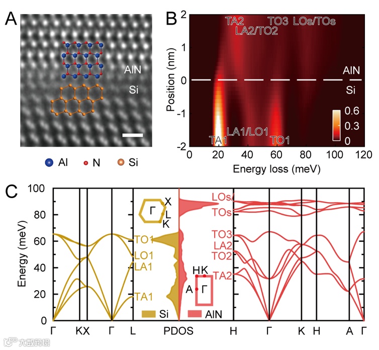 研究者首先利用原子分辨高角环形暗场像(HAADF)图像确定了AlN/Si的界面原子结构,又测量了界面处的电子能量损失谱(EELS),并结合分子动力学模拟计算的声子色散和态密度确定了EELS各个特征峰对应的声子模式。他们发现Si-TA1(TA:横声学支)模式能够穿过界面渗透到AlN层,Si-LA1/LO1(LA:纵声学支;LO:纵光学支)模式和AlN-TA2模式在界面处相连,Si-TO1(TO:横光学支)模式也在界面处连接到AlN-TO3模式,形成跨界面的桥梁,将Si和AlN的体声子连接起来。AlN-LOs/TOs模式穿透到Si层,但在~1 nm内迅速衰减。
