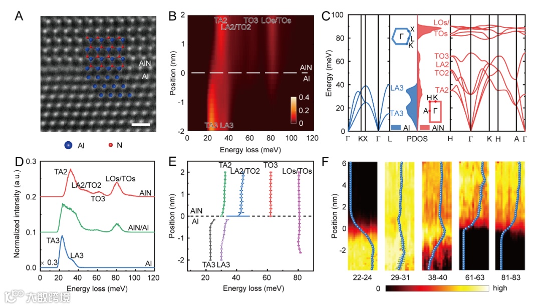 图 3 AlN/Al 的原子结构和界面声子。(A) AlN/Al界面的原子HAADF图像和结构。比例尺,0.5 nm。(B) AlN/Al界面声子EELS谱。(C)Al和AlN的面内布里渊区、声子色散和态密度的面内分量。(D) 体态AlN、AlN/Al界面和体态Al的 EELS谱。(E) AlN/Al界面的不同子声子的能量变化。(F)不同声子模式的强度分布图。