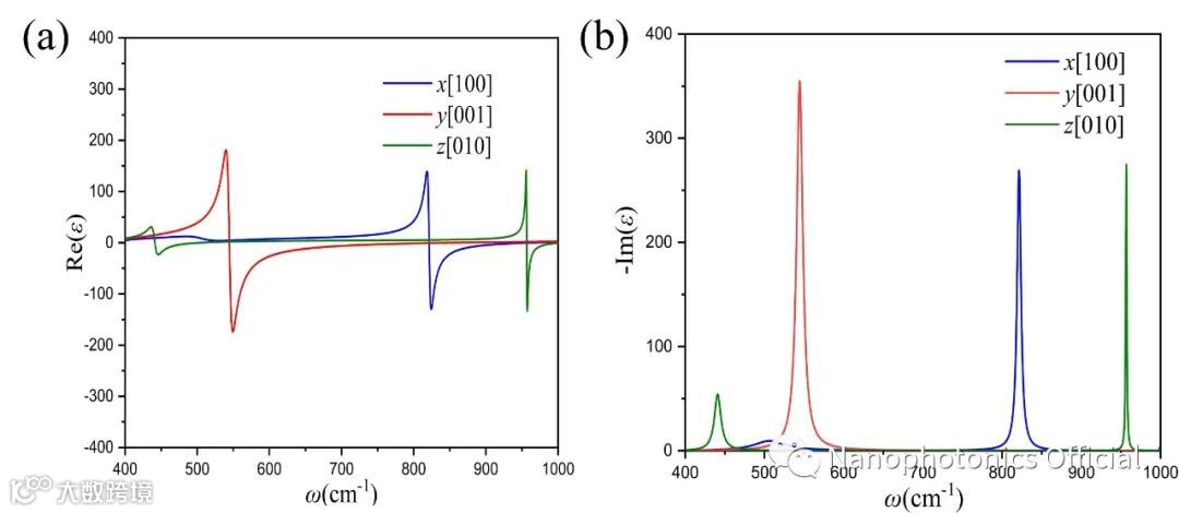 图2 三氧化钼的介电常数的(a)实部和(b)虚部与频率的关系。