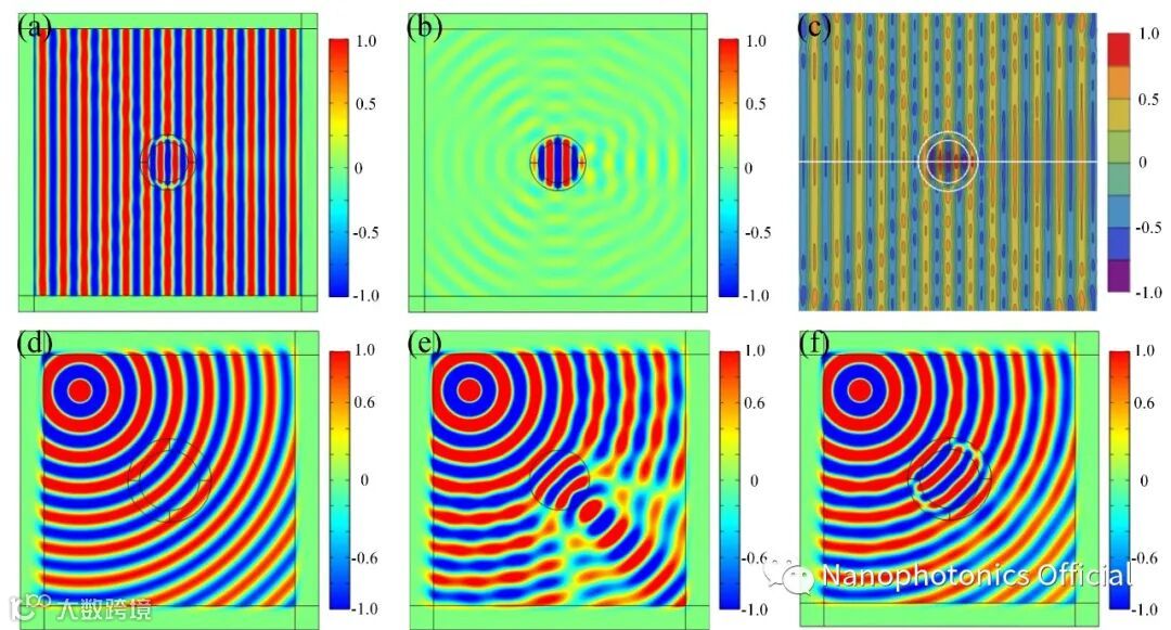图3 平面波激发,α-MoO3隐身聚光器的(a)Hz分量图和(b)散射场的数值解,(c) Hz分量解析解。点光源激发下(d)真空条件,(e)纯光纤圆柱和 (f)α-MoO3隐身聚光器的Hz分量图