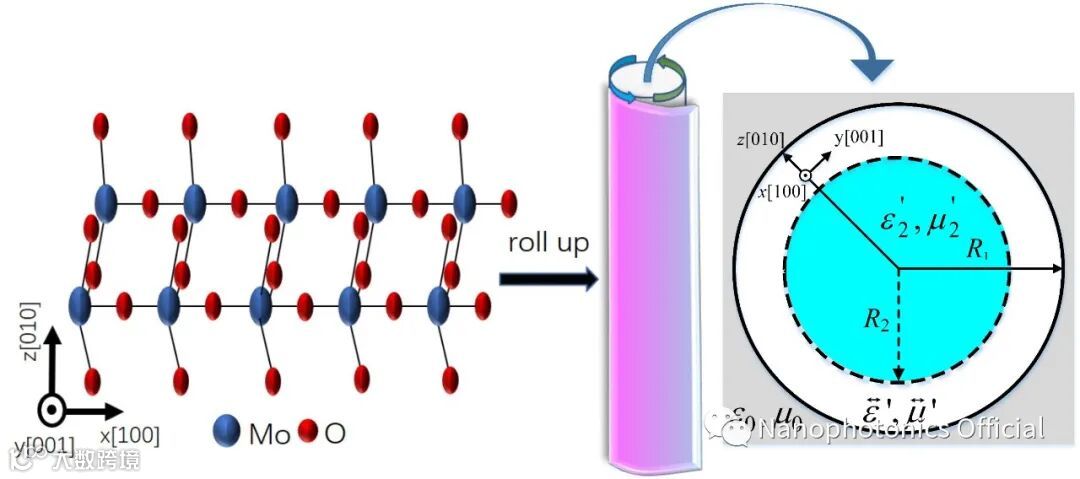 针对这些问题,近日厦门大学陈焕阳教授团队在Nanophotonics发表最新文章,在变换光学基础上使用了一种当前热门的自然双曲材料α-MoO3。当α-MoO3薄膜被卷在光纤上时(如图1所示),基于变换光学原理和Fabry-Pérot共振机制,电磁参数的无限大问题将会被解决,以达到隐藏电磁照明下的物体的目的,即隐身。此外,还研究了这种新型隐身聚光器的全角度隐身聚光效果和错觉效应。