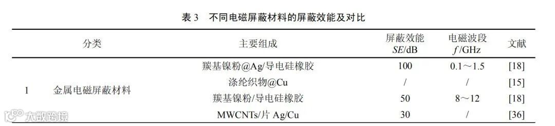 江南大学的徐文正等在 PET 非织布表面采用直流磁控溅射技术沉积 Ag 膜,兼具 Ag 优异的导电性,极大提高了反射损耗,0.03~1.5 GHz 频率范围内,屏蔽效能达 39.37 dB,屏蔽性能中等。北京工商大学的温变英等通过流延法制备了具有梯度分布结构的聚醚酰亚胺 PEI/Ni 电磁屏蔽膜,梯度结构提高了吸收损耗和多次反射衰减,电磁屏蔽性能达 40 dB 左右,屏蔽性能中等。北京国电富通科技发展有限责任公司的郑永立等将硅烷偶联剂改性石墨烯涂料喷涂橡胶,兼具石墨烯优异的导电和导磁性能,制得电磁屏蔽材料,屏蔽效能达 82 dB,屏蔽性能良好。