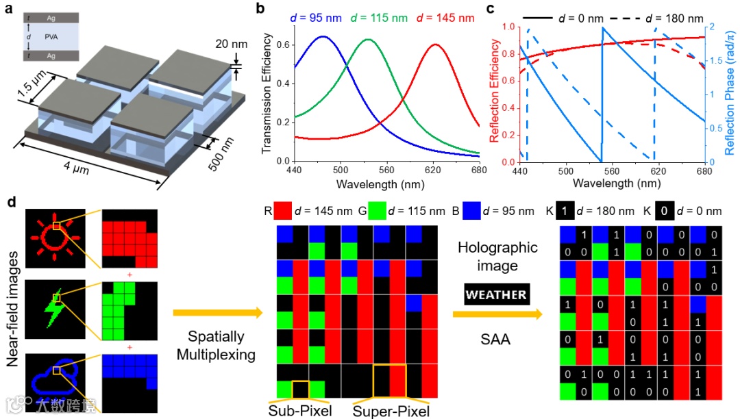 图1a为设计的由不同的MHM纳米腔混合而成的阶梯式MHM纳米腔超像素示意图。在透射模式的纳米印刷显示设计中,利用不同介质层厚度的MHM纳米腔的在红、绿、蓝波段的透射峰分别来显示多波长通道近场图像中的亮像素(图1b)。与此同时,额外选择两个在可见光具有低透射的MHM纳米腔(K1/K2)来显示近场图像的暗像素(图1c)。通过将这些阶梯式排列的MHM亚像素以空间复用的形式并合成超像素,从而可以实现多波长通道纳米印刷显示。在反射模式的全息设计中,K1/K2表现出相似的宽带高反射率和有明显差异的相移。因此,引入K1/K2这选项可以解耦光学响应中幅值/相位相关性:其一方面可用于显示纳米印刷中需要的暗像素,另一方面也为全息技术创造了二台阶相位编码的能力和自由度。图1d展示了三波长通道纳米印刷及同步全息显示的设计方案。首先将三个目标近场图像空间复用到一个联合编码空间,再采用模拟退火算法(SAA)对全息图的相位进行数值反演和优化,从而确定了整个编码空间的每个MHM亚像素的排布。由此,实现了图2a中多波长高光谱近场纳米印刷及远场全息显示的复用功能。