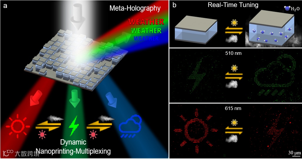 图2(a)可实时调控的纳米印刷复用及同步全息显示功能示意图。(b)加湿/干燥调控近场纳米印刷显示实时动态切换的原理及其实验观测图像。