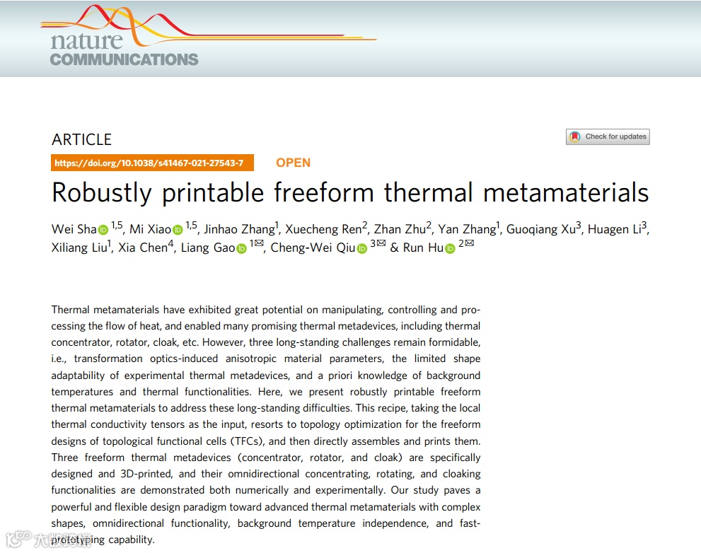 超构材料具有常规自然材料不具备的超常属性而备受关注,其通常由人为设计结构而获得。热超构材料作为超构材料的一员,可操控热流形成一系列的超常热学功能,如热隐身、热集中、热旋转等。近日,华中科技大学机械学院高亮教授团队与新加坡国立大学仇成伟教授、华中科技大学能源学院胡润副教授合作提出了一种稳健可打印的自由形状热超构材料拓扑优化设计方法,设计了具有自由形状的热集中、热旋转和热隐身超构材料。该工作以《Robustly printable freeform thermal metamaterials》为题在线发表在《自然·通讯》(Nature Communications)期刊上。