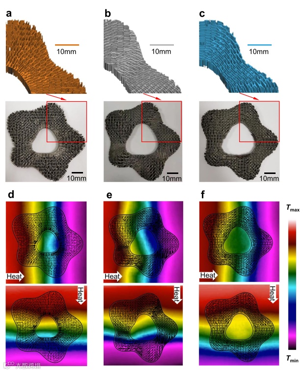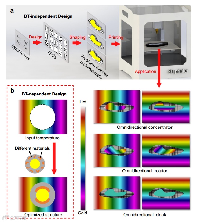 随着变换光学和散射抵消方法应用于热学,一系列具有不同功能的热超构材料纷纷被设计和制备,但目前热超构材料设计仍面临三大挑战:(1)利用变换热学法设计热超构材料需采用各向异性材料参数,而常规材料往往不具备,使得实验制备热超构材料难度大;(2)热超构材料结构形状受限,以圆形、椭圆形等规则形状的热超构材料制备居多,影响了热超构材料的工程适用性;(3)采用数值优化方法设计热超构材料依赖背景温度场(图1.b)和目标超常热学属性,影响了设计的灵活性和热超构材料的全方位功能性。因此,如何设计并制备具有自由形状且全方位功能性的热超构器件是热超材料领域亟需解决的难题。