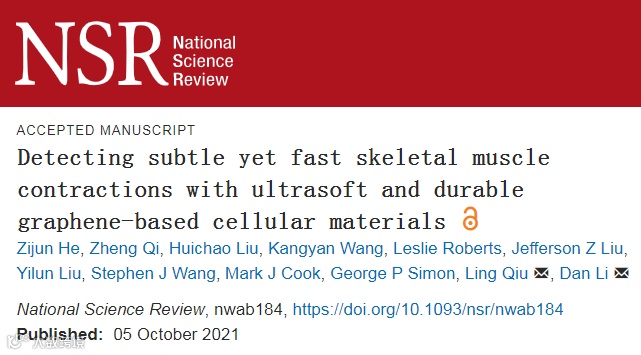 研究者利用超轻石墨烯气凝胶与硅橡胶界面间的高效应变传输机制,制备出高延展、超灵敏的石墨烯气凝胶柔性传感器,首次实现了对骨骼肌本征高频微小机械运动的实时精确监测,为肌动图检测的即时、柔性、可穿戴需求提供了新的技术途径。