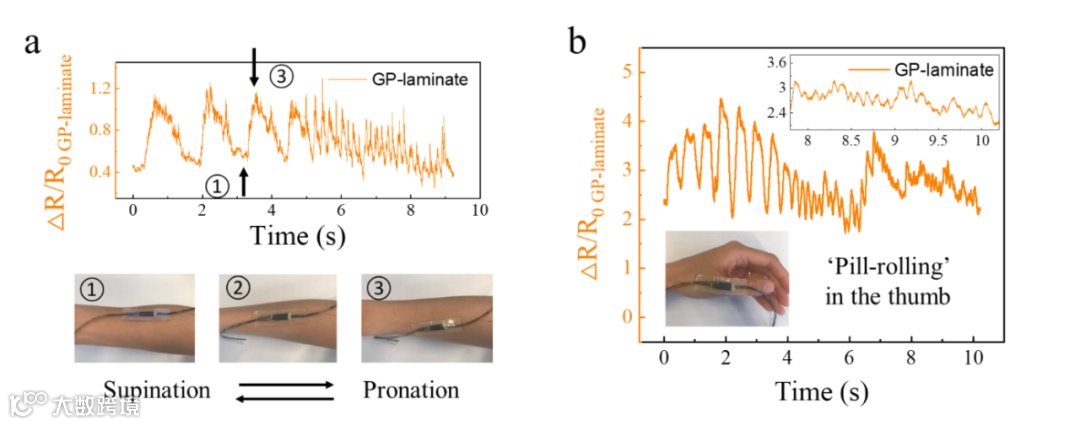 用石墨烯气凝胶基复合物传感器检测类似帕金森疾病的较高频(a)手臂与(b)大拇指不可控颤动、振摇。