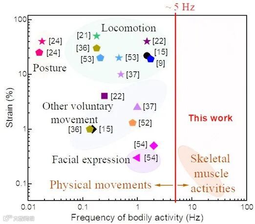 目前,医疗机构主要使用大型的精密肌电图或肌动图设备,来检测骨骼肌的功能,而它们无法满足人们对便携、即时、精准、低成本、高舒适度健康检测的需求。骨骼肌的本征运动幅度微小而快速,现有的聚合物基柔性传感器件难以实现即时、准确的检测。因此,开发新型柔性、可穿戴骨骼肌生理健康监测设备尤为重要与迫切。