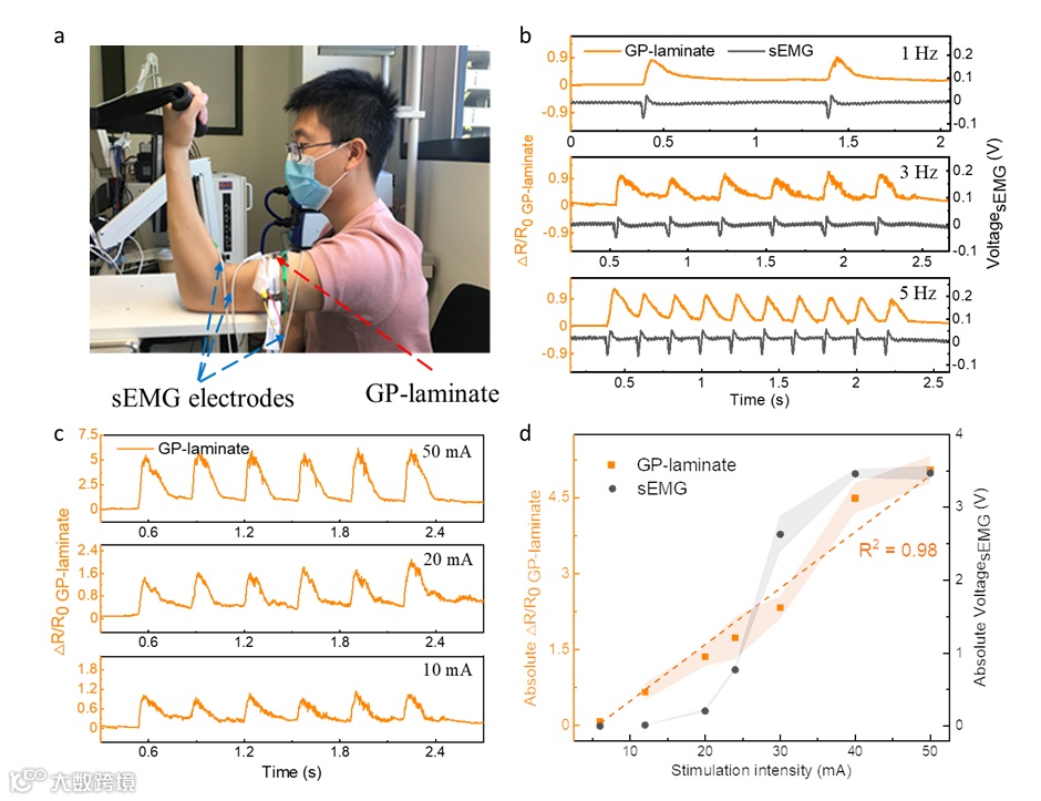 利用石墨烯气凝胶基复合物的宽频/超低应变力电响应能力,该团队首次将柔性应变传感器用于检测微小、快速的肌肉纤维运动,并发现石墨烯气凝胶基复合物器件与传统肌电测试结果高度一致。