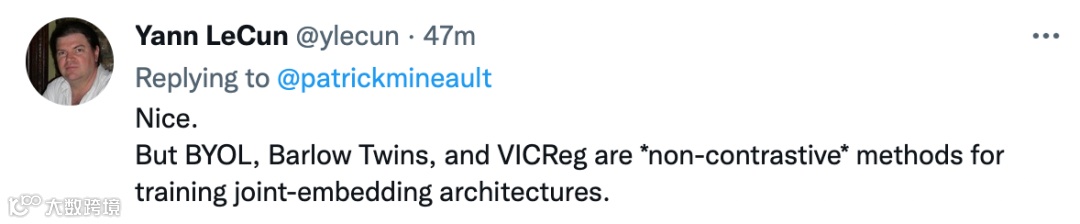 「Nice!但是 BYOL、Barlow Twins 和 VICReg 是用于训练联合嵌入架构的「非对比」方法。」
