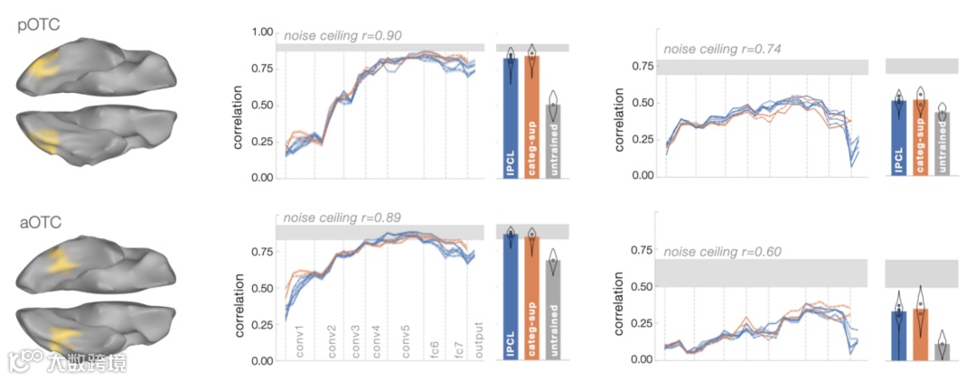 腹侧信息流是否可以由一个不经过监督式学习训练的网络来解释?他们使用功能磁共振成像而不是单个神经元的记录来评估这一点。他们发现结果与Zhuang的文章大体一致,并且有着自己独特的实例——对比自我监督,以及其他类似的解释 fMRI 数据的结果。