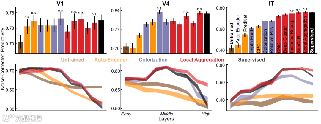 作者发现,无监督和自监督方法学习的表征与腹侧流(V1,V4,IT)神经元实现方式一致。论文摘要指出: