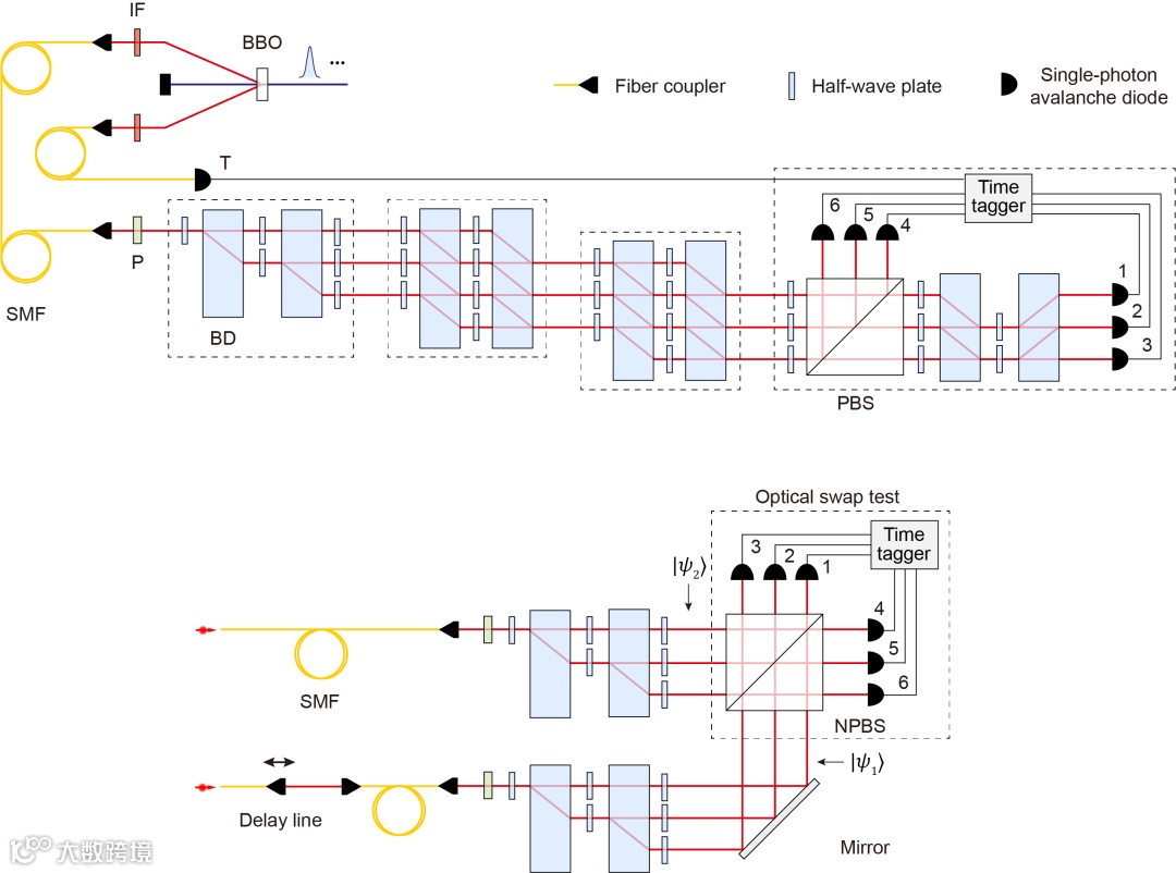 研究人员首先从算法理论研究出发,结合3-SAT量子验证算法和直积态判定算法,并进一步针对实验进行优化,发展了适用于光子系统实现的两证明者完整量子验证算法,包括满足性测试、均匀性测试、对称性测试和直积态测试四项测试。该算法考虑量子多项式时间可验证问题,由quantum-Merlin-Arthur(QMA)复杂性来定义,是NP复杂性的量子类比。在QMA(K)证明系统中,K个计算能力强大的、相互之间不进行交流的证明者(称为Merlin),发送K个相互之间非纠缠的量子态作为量子证据给一个计算能力有限的验证者Arthur。Arthur在他的量子计算机上验证证据并做出接受或拒绝证据的决定。