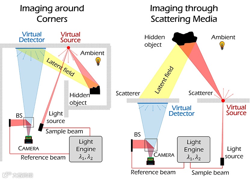 这种被称为合成波长全息术(synthetic wavelength holography)的新方法是通过将相干光间接散射到隐藏的物体上,然后光在这些物体再次散射并传播回相机。