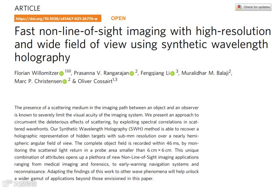 近年来,已经有不少研究基于非视线成像(NLoS)原理,尝试恢复隐藏目标的图像。但是这些方法通常都有不同程度的问题。要么分辨率低,视角极小,需要耗时的光栅扫描,要么需要大的探测区域来测量散射光信号。